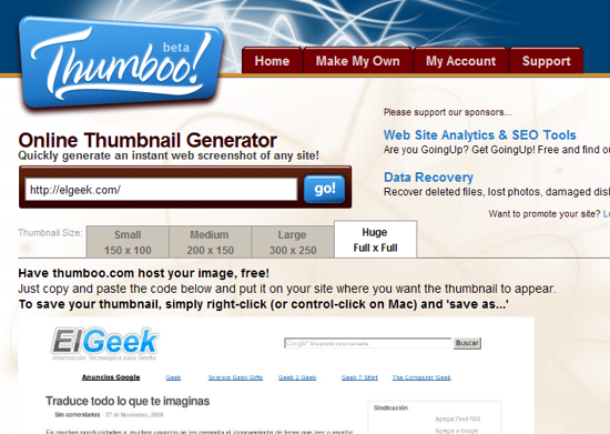 Thumboo es una curiosa aplicación web que se encarga, como podrán percibir, de tomar capturas de pantalla de cualquier sitio de la red con tan solo ingresar su URL, para luego ofrecerlo en distintos tamaños listos para ser publicados en un blog, un foro, o en cualquier página web.